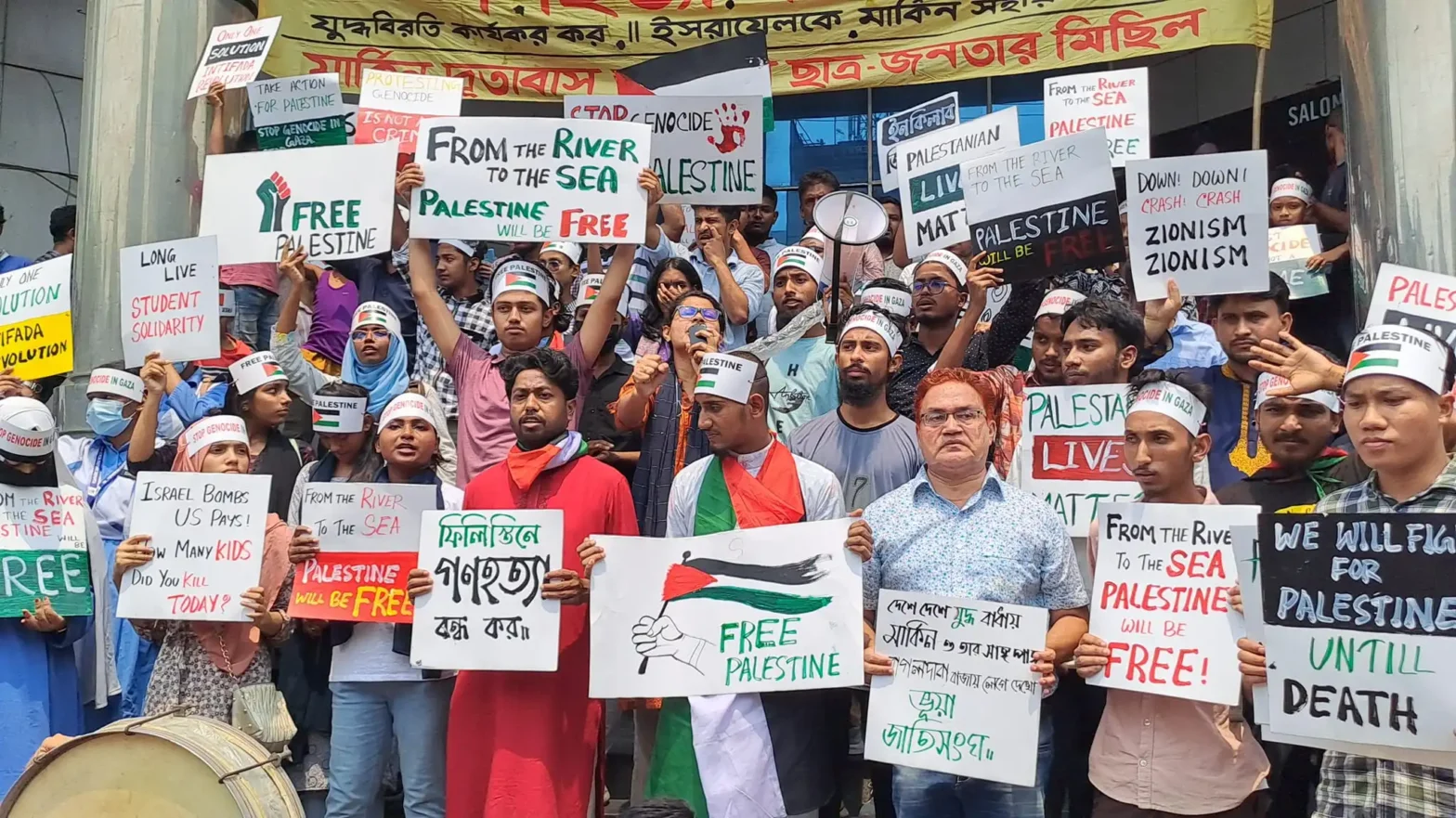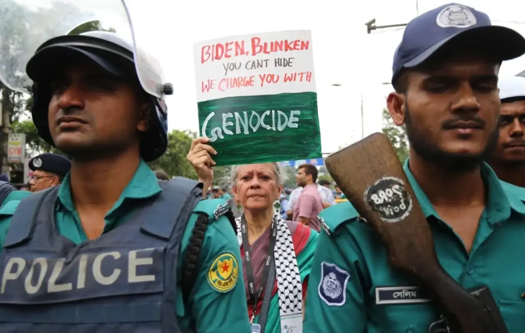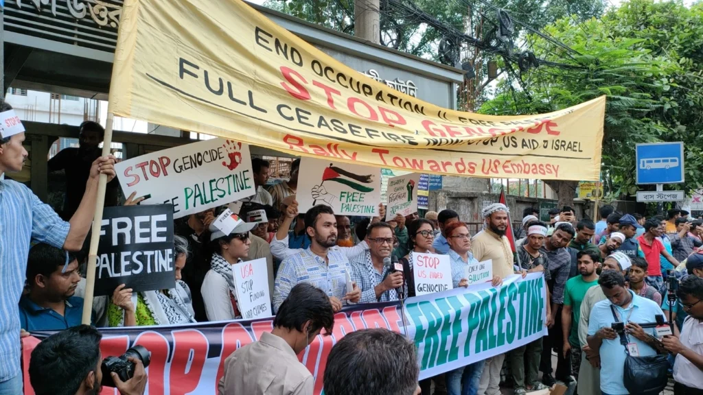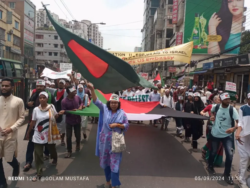আজ ৯ মে ২০২৪, বৃহস্পতিবার, ফিলিস্তিনে ইসরায়েলি গণহত্যা বন্ধ ও স্থায়ী যুদ্ধবিরতির দাবিতে ঢাকাস্থ মার্কিন দৃতাবাস অভিমুখে ছাত্র-জনতার বিক্ষোভ মিছিল অনুষ্ঠিত হয়। প্রগতি স্মরণির সুবাস্ত টাওয়ারের সামনে থেকে মিছিল শুরু করে মার্কিন দূতাবাস অভিমুখে যাত্রা শুরু করলে বাঁশতলার মোড়ে পুলিশ বাঁধা দেয়; সেখানেই পরে বিক্ষোভ সমাবেশ ও প্রতিবাদী সাংস্কৃতিক আয়োজন অনুষ্ঠিত হয়।