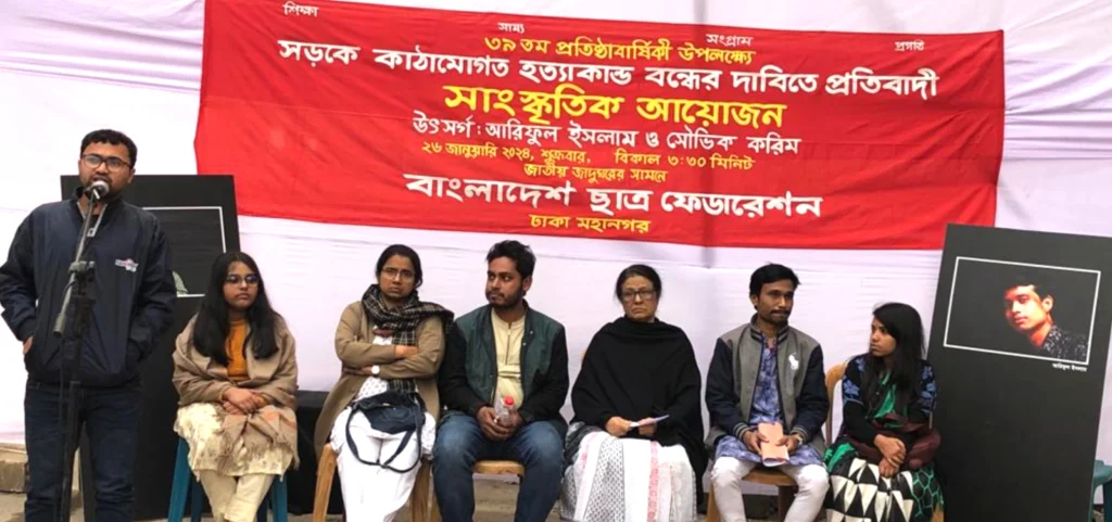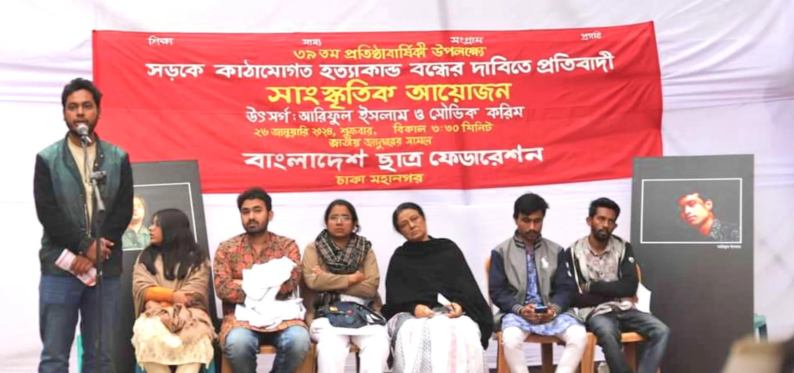 আজ ২৬ জানুয়ারী ২০২৪, শুক্রবার, শাহবাগ, পাবলিক লাইব্রেরীর সামনে ঢাকা মহানগর বাংলাদেশ ছাত্র ফেডারেশনের আয়োজনে সড়কে কাঠামোগত হত্যাকান্ড বন্ধের দাবিতে প্রতিবাদি সাংস্কৃতিক আয়োজন অনুষ্ঠিত হয়। ঢাকা মহানগর ছাত্র ফেডারেশনের সভাপতি অনুপম রায় রূপকের সভাপতিত্বে এবং সাধারণ সম্পাদক হাসান আল মেহেদী ও দপ্তর সম্পাদক নুসরাত হকের সঞ্চালনায় আলোচনায় অংশ নেন সড়ক দূর্ঘটনায় নিহত সৌভিক করিমের মা বন্যা করিম, গণসংহতি আন্দোলনের রাজনৈতিক পরিষদের সদস্য ও গার্মেন্ট শ্রমিক সংহতির সভাপ্রধান তাসলিমা আখতার, বাংলাদেশ ছাত্র ফেডারেশনের সাধারণ সম্পাদক সৈকত আরিফ, ছাত্র ফেডারেশনের সাবেক সভাপতি গোলাম মোস্তফা, নারী সংহতির কেন্দ্রীয় নেতা সুমি রেক্সোনা পারভীন, ঢাকা মহানগর শাখার সাবেক সাধারণ সম্পাদক এম এইচ রিয়াদ, ঢাবি শাখার আহৃবায়ক আরমানুল হক, ঢাকা মহানগর শাখার নেতা তুহিন ফরাজী, জহির রায়হান ও রাকিব হোসেন। সাংস্কৃতিক আয়োজনের শুরুতেই সড়কে কাঠামোগত হত্যাকান্ডের শিকার হওয়া মানুষদের স্মরণ করে ১ মিনিট নীরবতা পালন করা হয়।